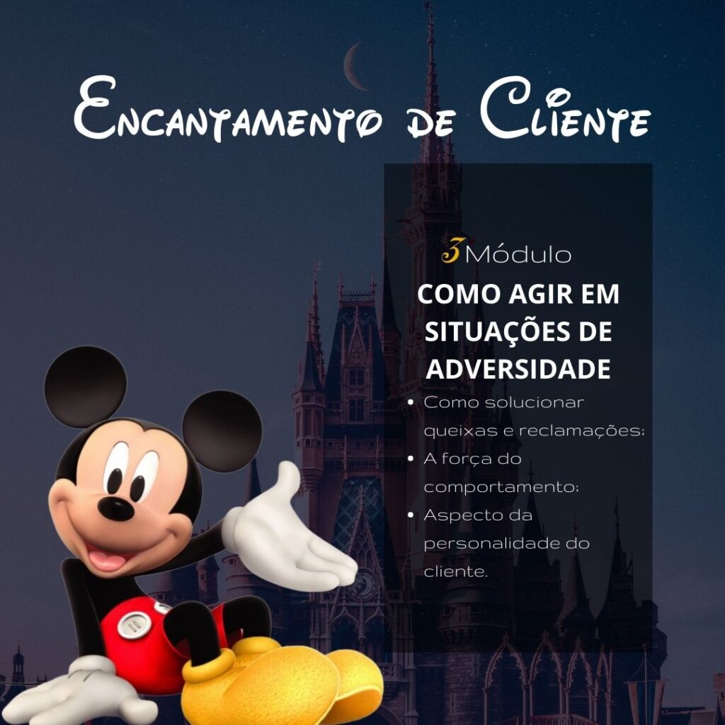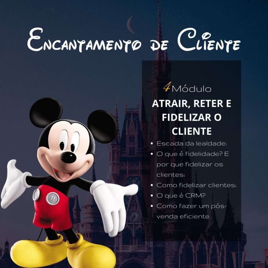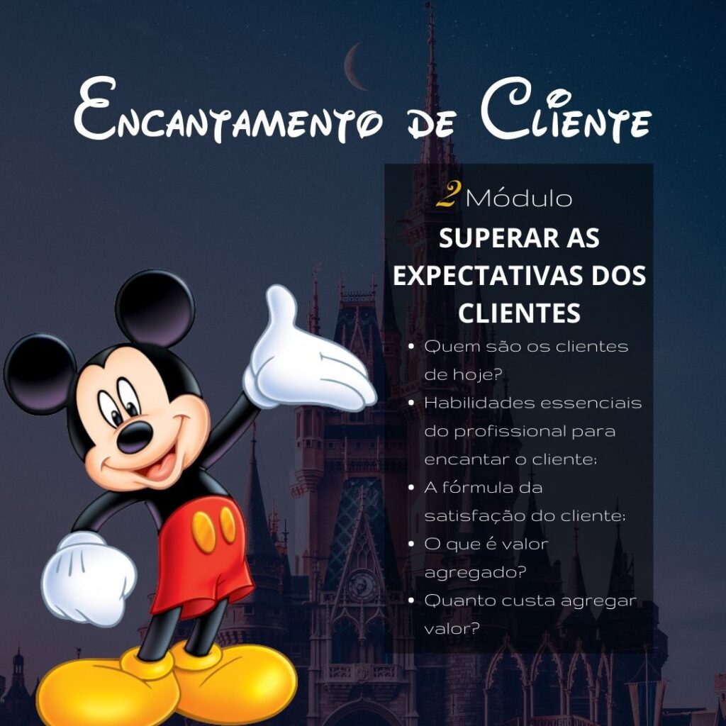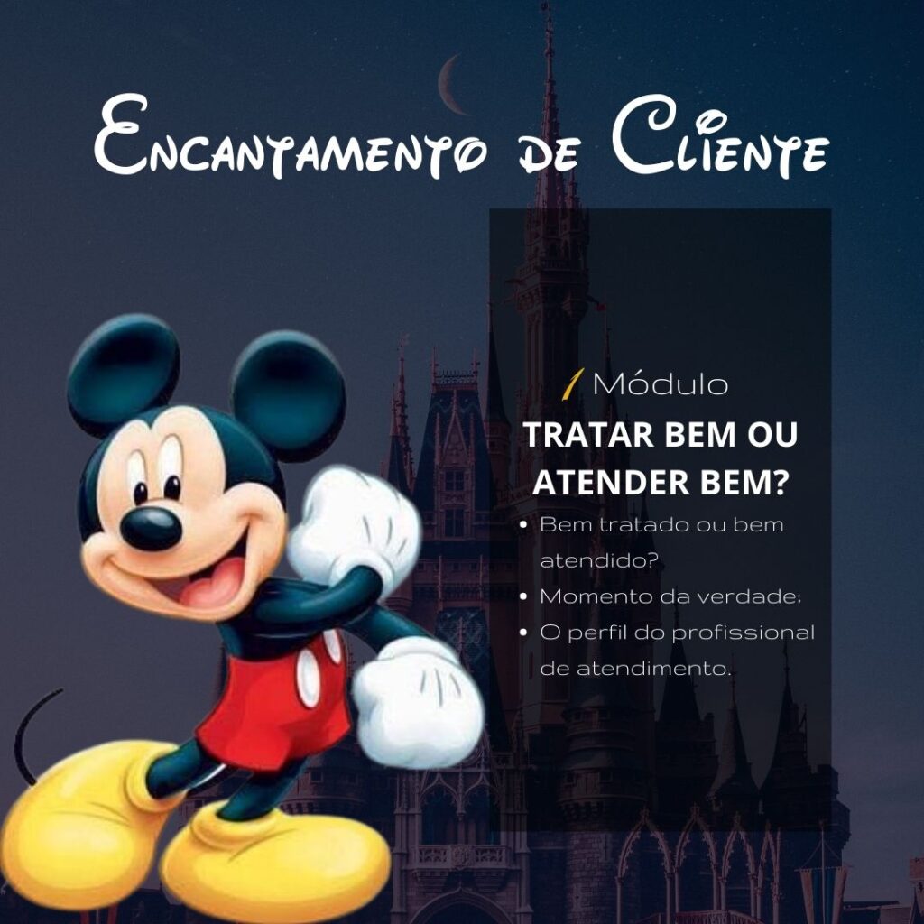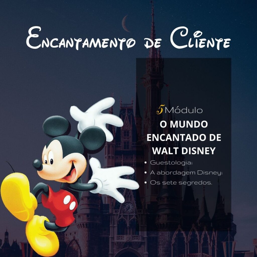 Neste curso online você vai aprender baseado no modelo Disney, atendimento de excelência com conteúdo teórico-prático e ferramentas para construir um atendimento de excelência. Aprenda os segredos de uma organização que por mais de 80 anos, supera as expectativas dos seus clientes diariamente.
