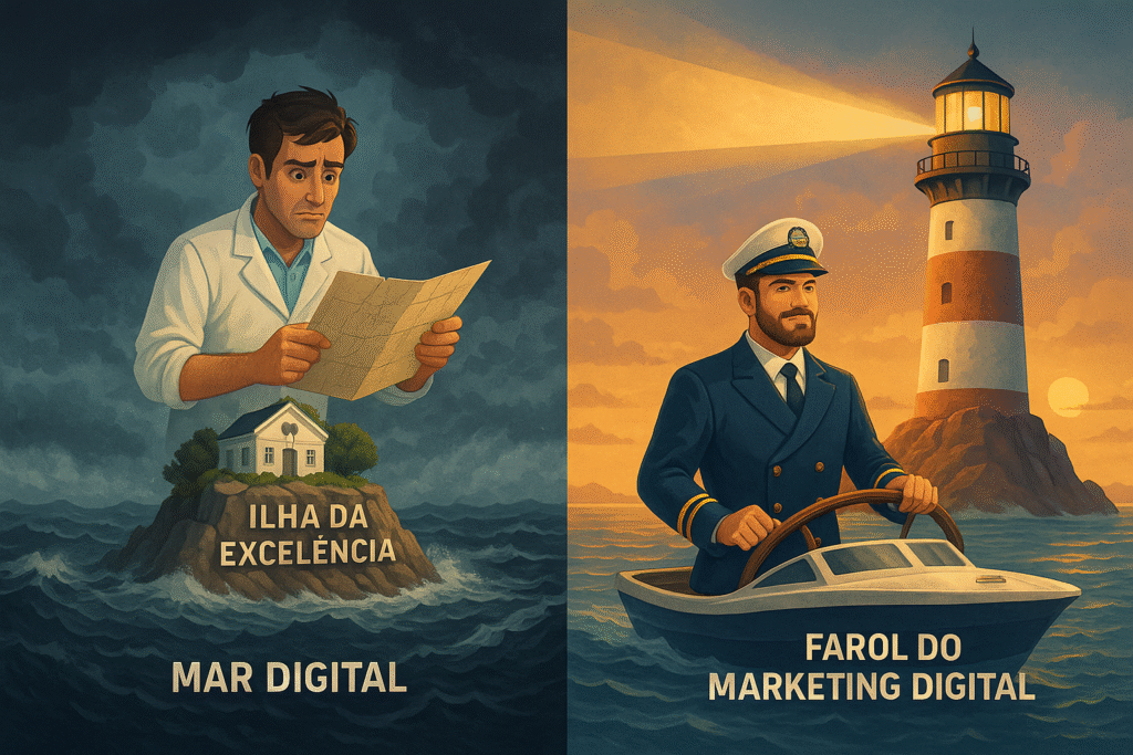 Mas, de repente, o mundo mudou. Um vasto e impiedoso Mar Digital surgiu ao redor da sua ilha. E nesse mar, milhões de potenciais pacientes estão navegando, buscando por um porto seguro, por um profissional como você. O problema? Eles não conseguem te encontrar. Suas habilidades, sua paixão, sua excelência estão confinadas à sua ilha, invisíveis para quem mais precisa delas. O boca a boca, antes um rio caudaloso que trazia pacientes à sua porta, tornou-se um pequeno riacho, quase seco. Você se sente frustrado, seu talento está sendo subutilizado, e a agenda, que deveria estar cheia, tem lacunas preocupantes. A cada dia, a maré da concorrência digital sobe, e você se sente à deriva, sem um mapa, sem uma bússola para navegar nesse novo oceano.